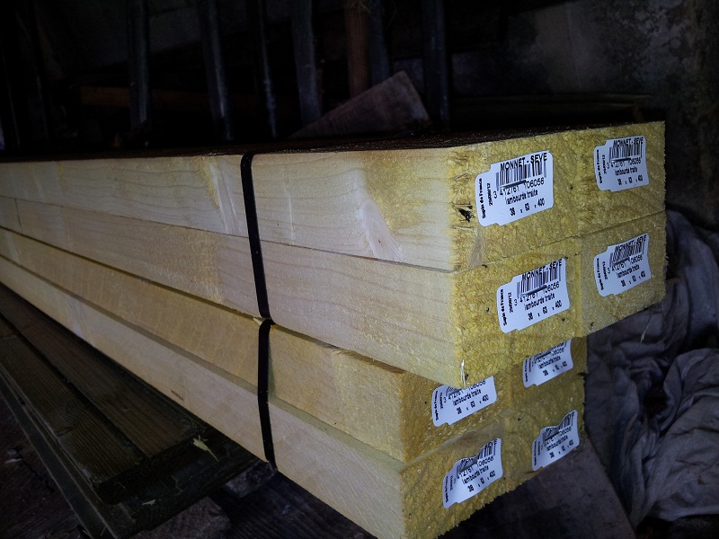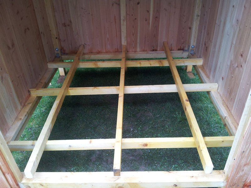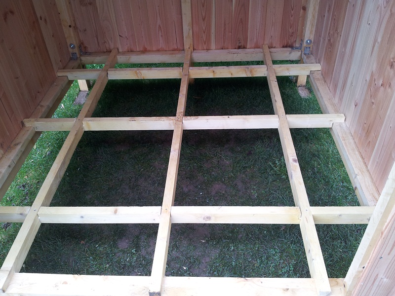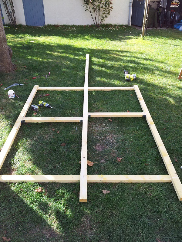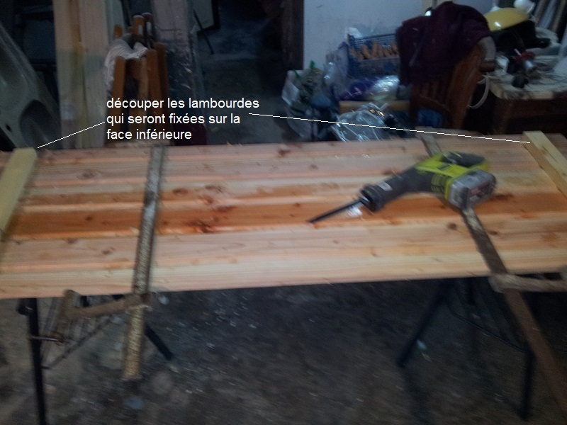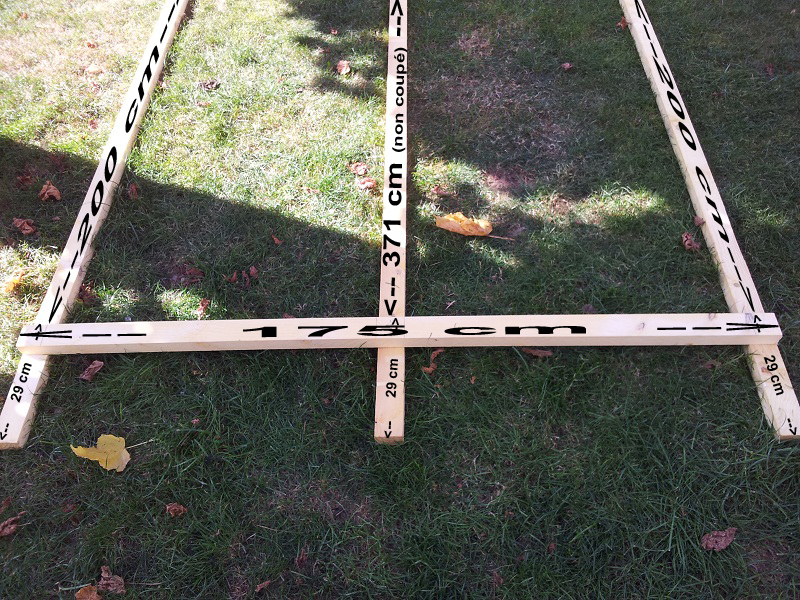 Couper 2 lambourdes à une longueur de 2,25 m (il reste deux morceaux de 1m75) Les présenter par terre verticalement et parallèlement à plat sur la tranche la plus large Entre les deux et à 1,2 m de distance, poser deux lambourdes de 4m non coupée
