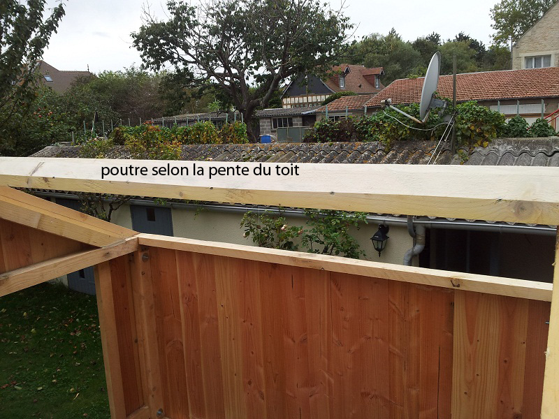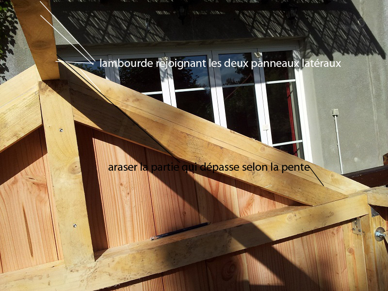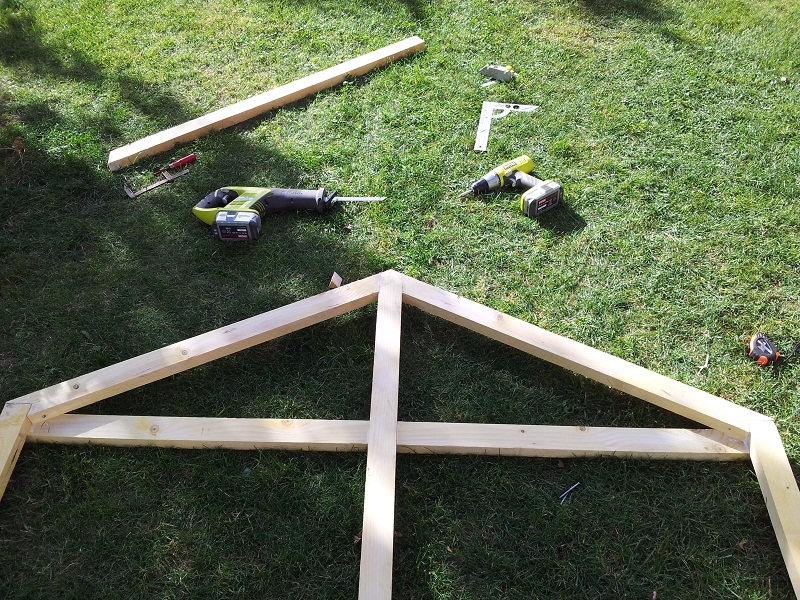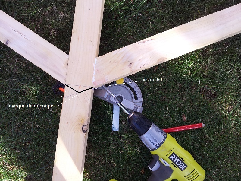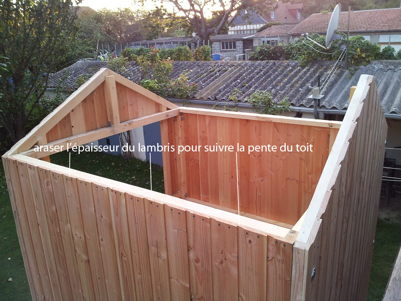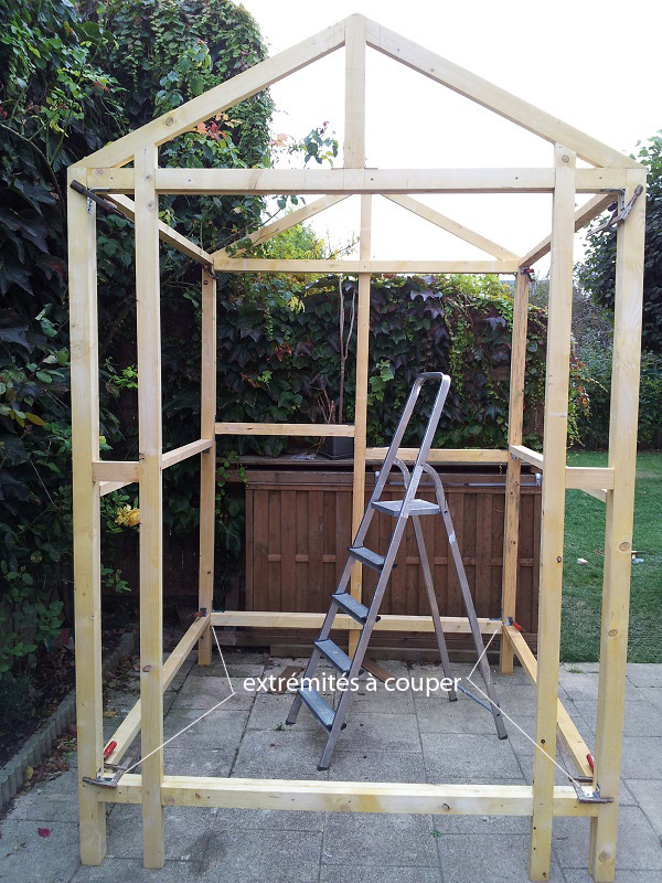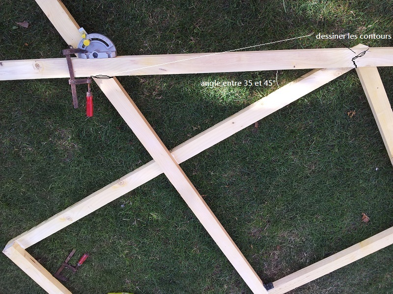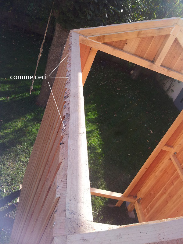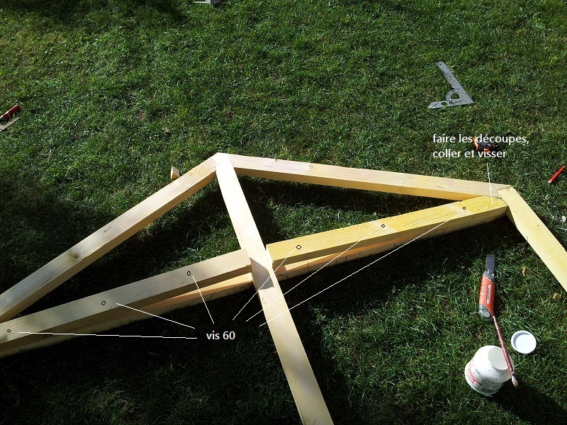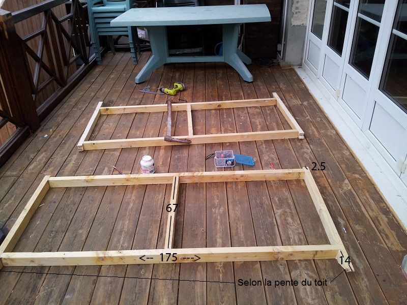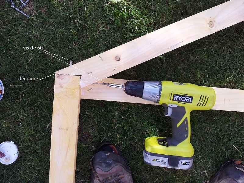 Présenter une chute de lambourde alignée sur le montant central et le montant de côté pour assurer la pente du toit. Dessiner les marques de découpe Couper les deux montants verticaux intérieurs à la jonction des montants transversaux Découper les montants transversaux, les coller et les visser  |