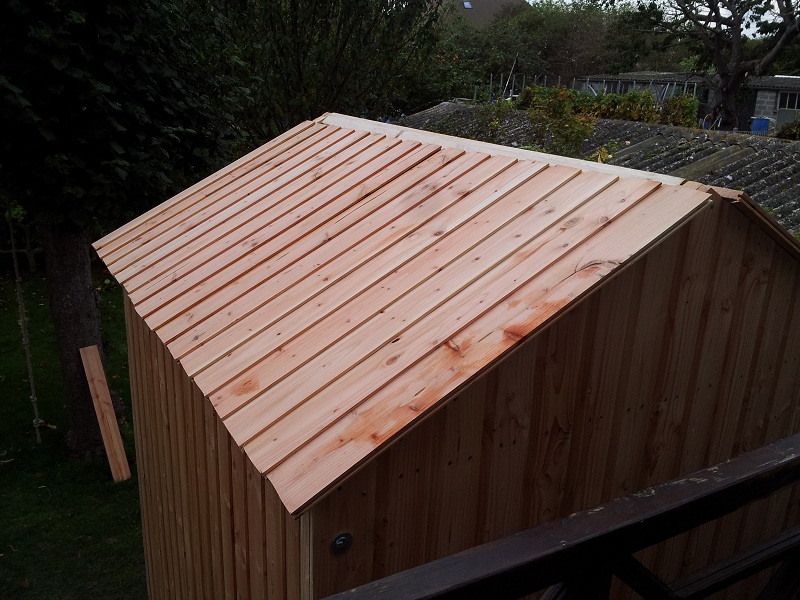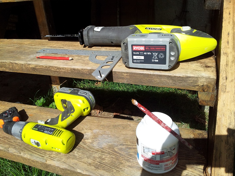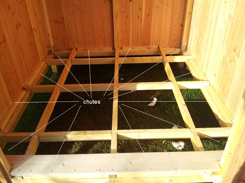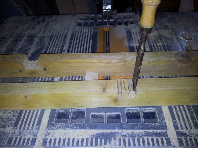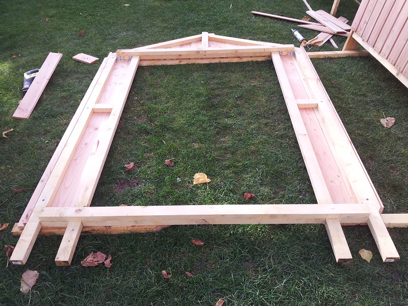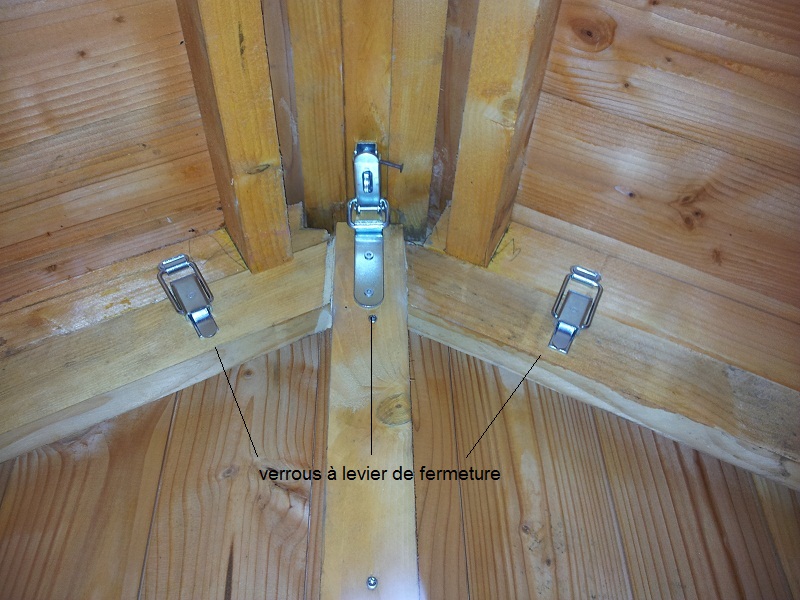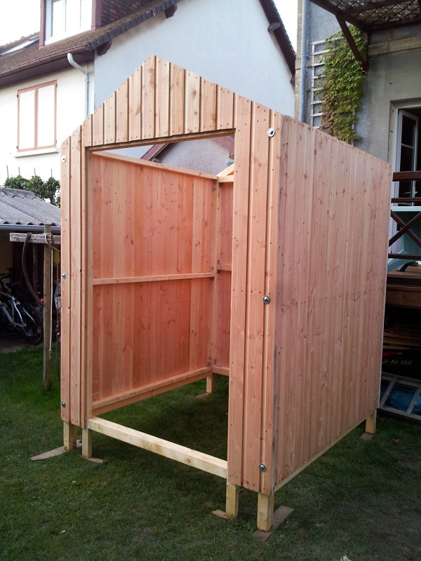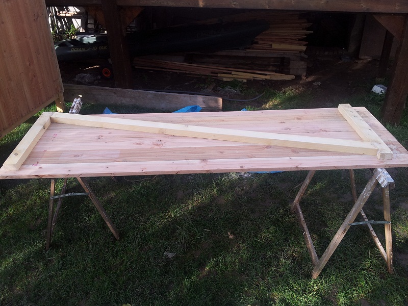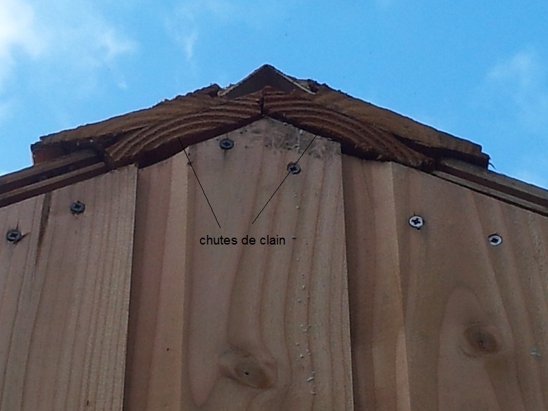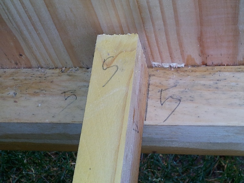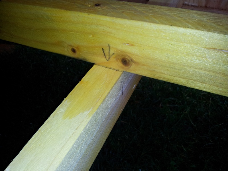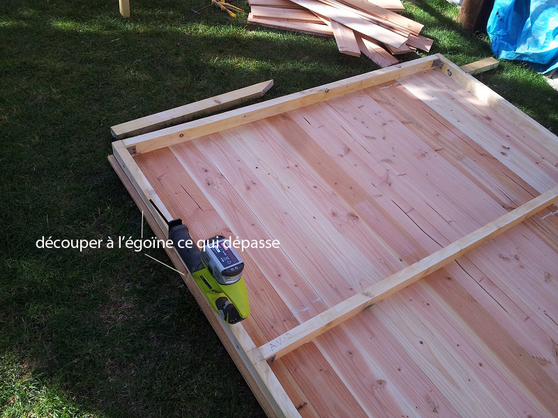 Présenter une chute de lambourde alignée sur le montant central et le montant de côté pour assurer la pente du toit. Dessiner les marques de découpe Couper les deux montants verticaux intérieurs à la jonction des montants transversaux Découper les montants transversaux, les coller et les visser  |
