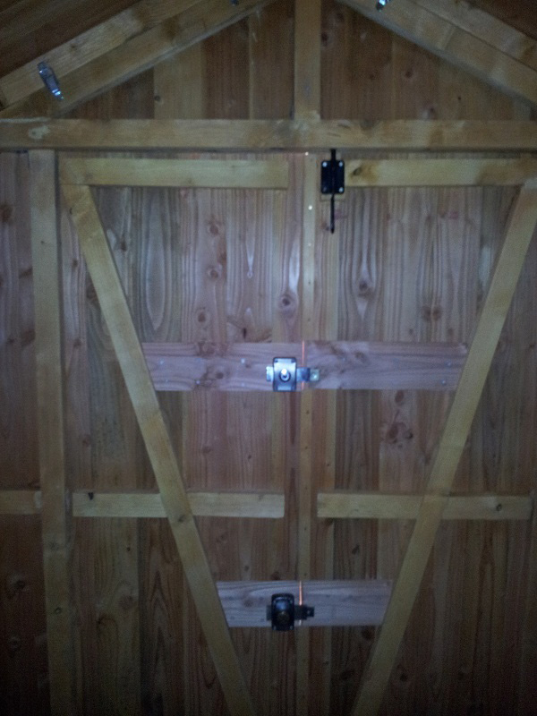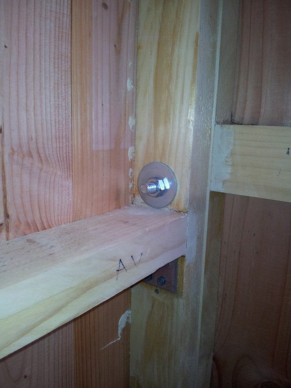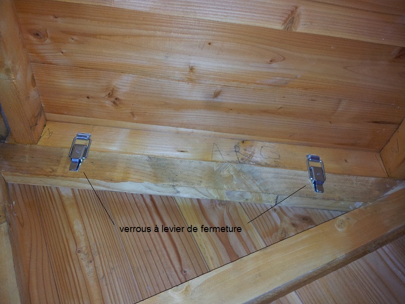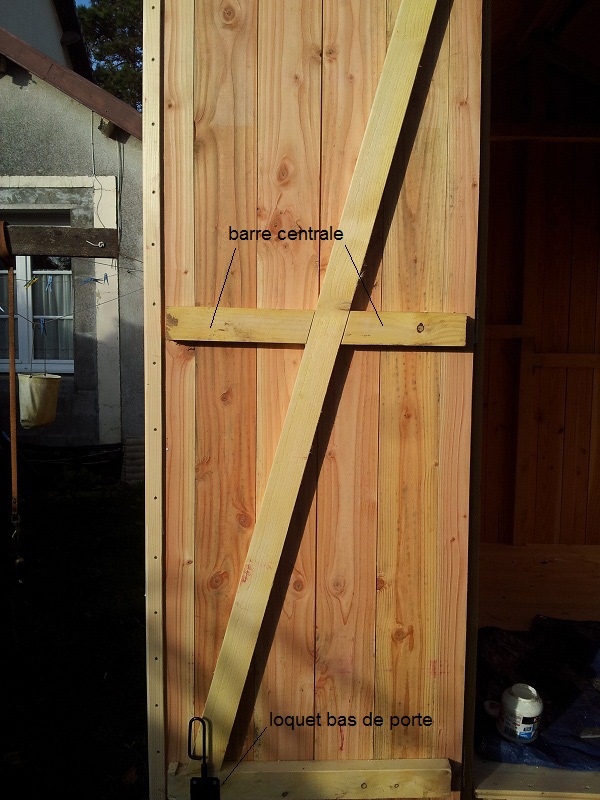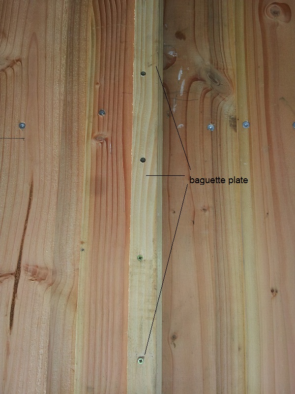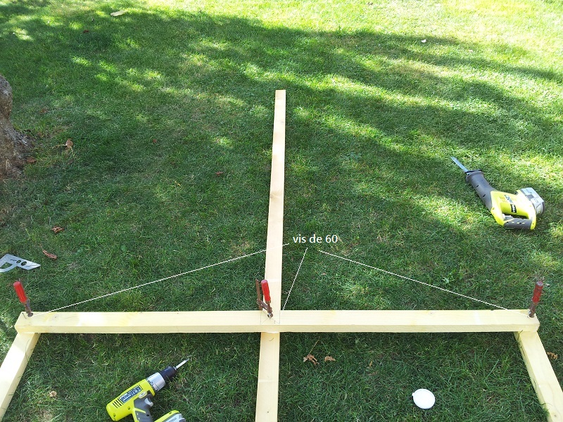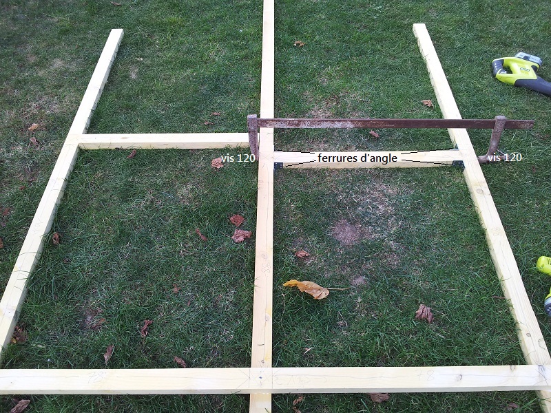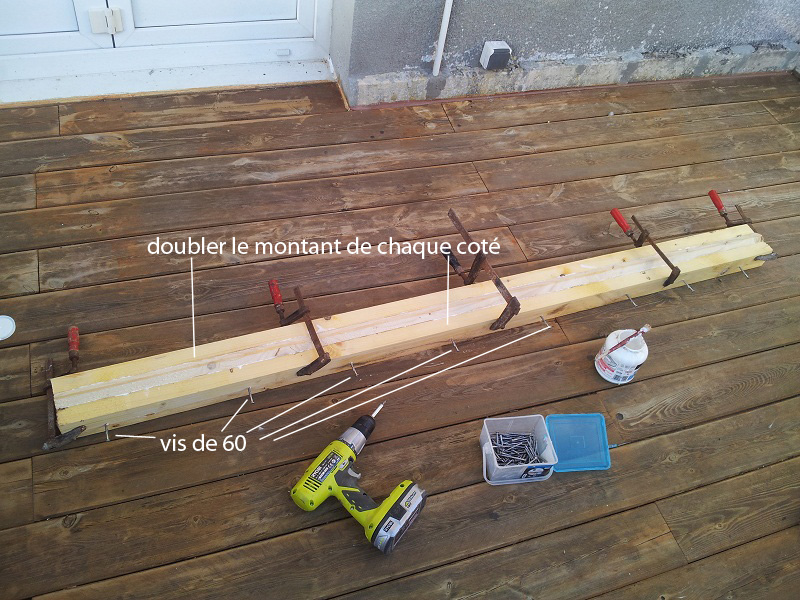 Retourner l'ensemble et renforcer le montant vertical central par un montant identique d'une longueur égale à celle auquel il est accolé moins la largeur d'un montant (ici 68mm) plus l'épaisseur du lambris (ici 19mm), (soit ici hauteur du montant moins 49mm) Mettre une vis verticale de 120 à chacun des montants  |