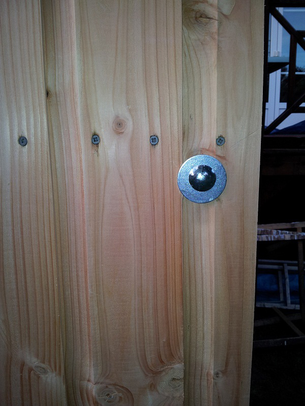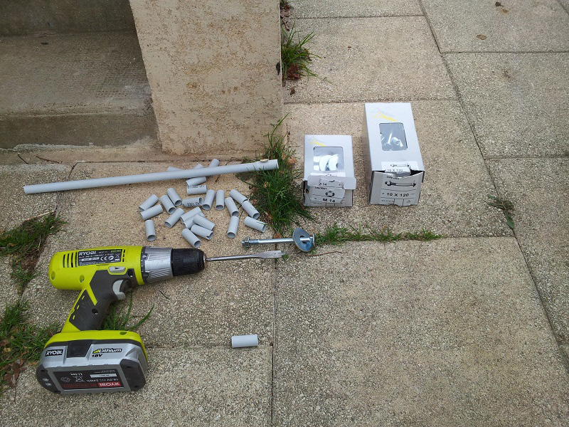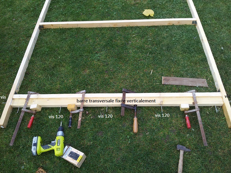 Retourner l'ensemble sur lui-même comme pour le panneau arrière Solidariser les 2 montants gauche et les 2 montants droits par une barre transversale vissée sur le côté par une vis de 120 en s'assurant que l'espace entre les 2 montants centraux est bien de 120cm  |