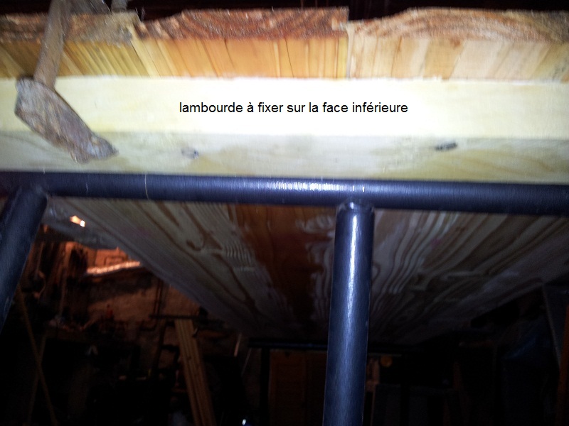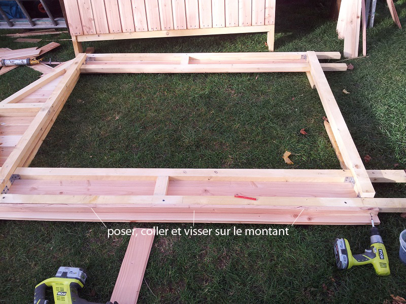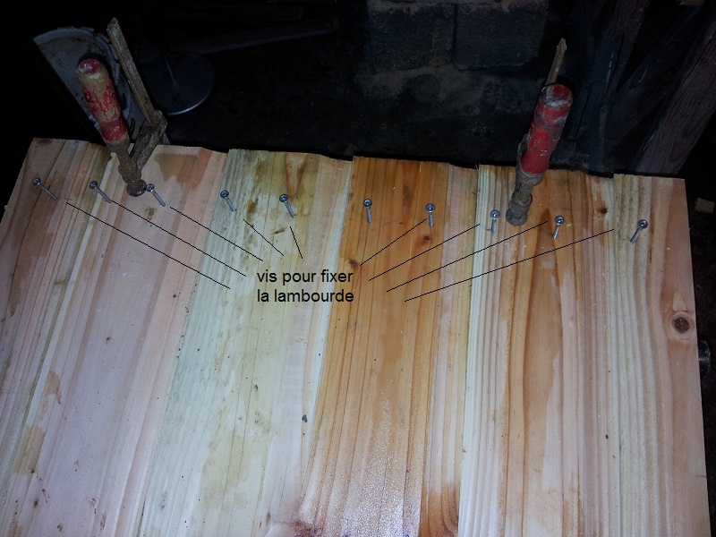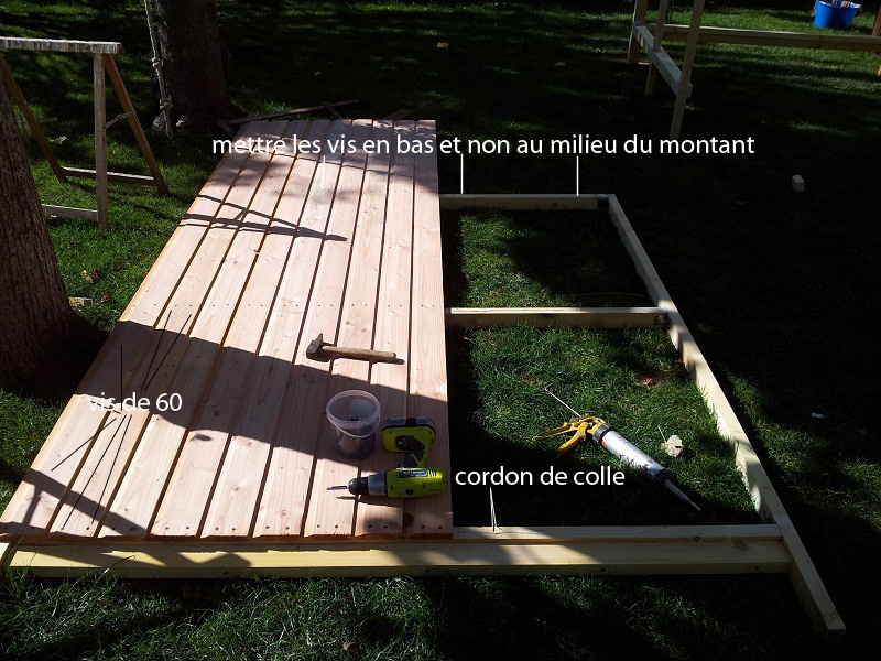 Tracer un trait à 29 cm du pied de chaque lambourde (idem panneau arrière) Présenter un des 2 morceaux de 1m75 transversalement au-dessous du trait de 29 cm Encoller uniquement sur les 2 montant du milieu et visser avec des vis de 60  |