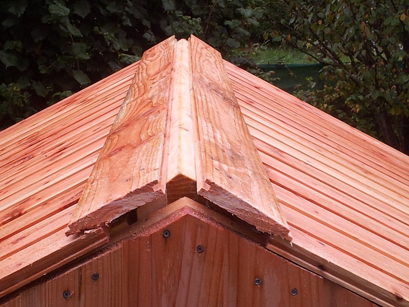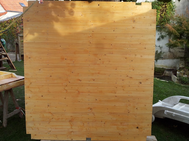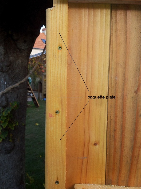 Fixer au milieu de la barre transversale haute un montant identique à celui de la face arrière avec ferrures d'angle et vis de 120. (un bon moyen de marquer les parties à découper est de poser le panneau arrière fait précedemment sur ce panneau avant et de tracer les découpes à effectuer pour avoir une pente de toit à l'identique)  |